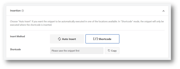 You have the option to manually copy the code snippet from here and paste it anywhere on your website as a shortcode. A WordPress function can be chosen as the location where the code snippet will be automatically added, or you can use the “Auto Insert” option.