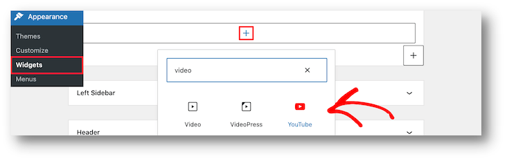 Next, select the block for the kind of video you want to include by clicking on it. For instance, YouTube.