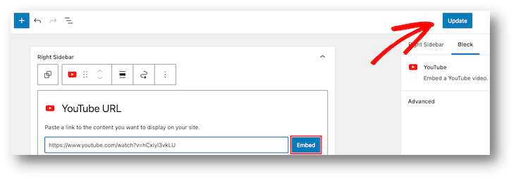 The next step is to paste the video URL into the box, choose “Embed,” and the widget area will automatically add the video.