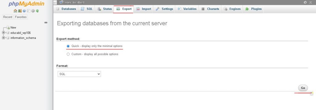 On the next screen, select the “Quick” export method and click the “Go” button. This will download a .sql file containing a copy of your WordPress database to your computer.