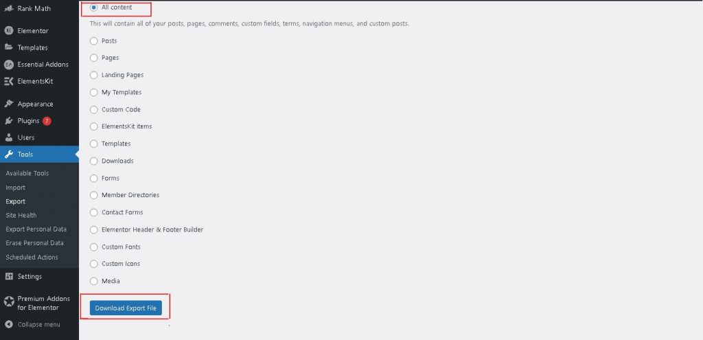 On the next screen, you will have the option to export all of your content or just specific types of content (e.g., posts, pages, etc.). Select the content you want to include in the backup and click the “Download Export File” button.