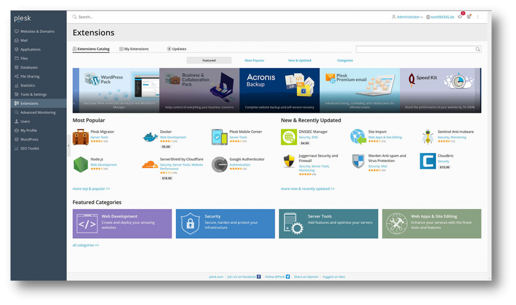 Management of websites, emails, and databases will be faster thanks to automation provided by Plesk. Every extension installs with just one click.
