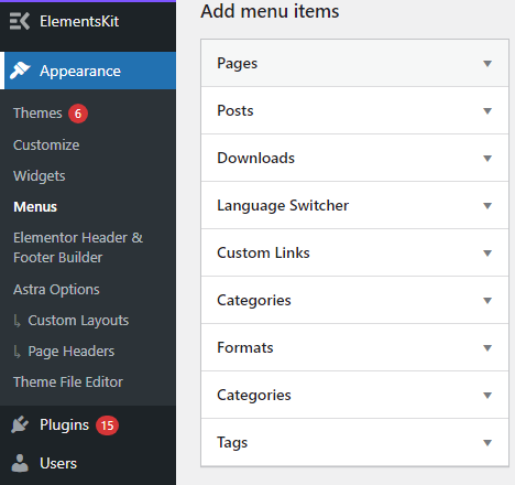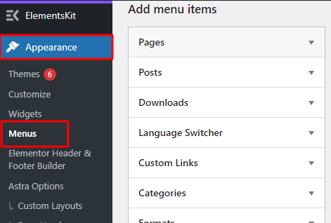 Now, you can start adding your menu items. Add website’s categories, posts, and pages to your custom menus from the left column.