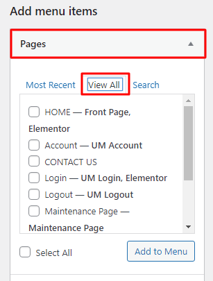 5. Select Pages > View All. Choose every page you want to be included in your menu by check boxes.