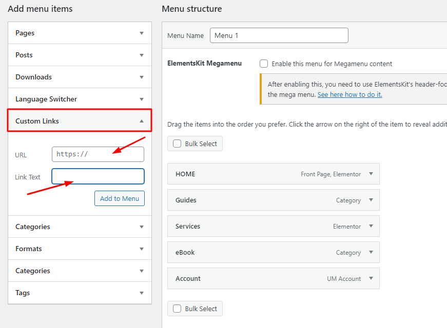 2. Each link must have a URL (its individual web address) and Link Text (the link’s name in the menu).
