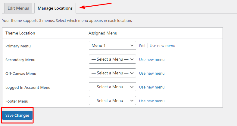 1. You will be taken to a page with a list of the various menu locations used in your Theme after selecting the Manage Locations tab on the Menus page.