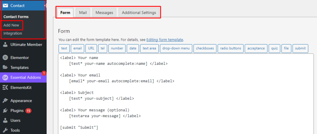 - Familiarize yourself with these tabs to navigate the plugin effectively. They include “Contact Forms”, “Integration”, “Mail”, “Messages”, “Additional Settings”, and “Tools.”