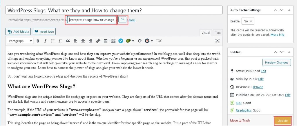 Don’t forget to click the “Update” or “Publish” button. The new slug will now be reflected in the full URL of the page or post.